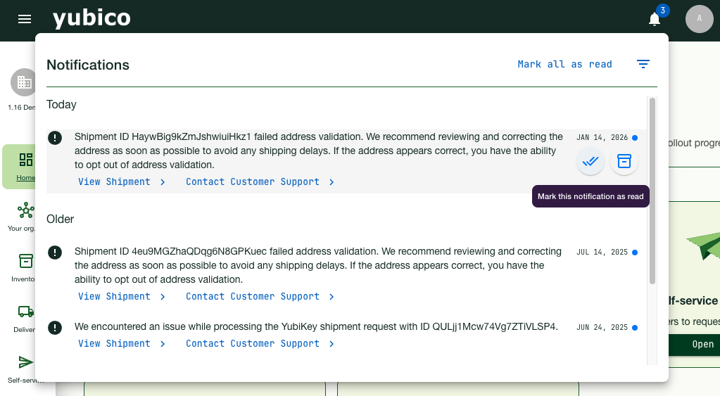 Notification interactions are personalized. When you mark a notification as read, it will only be marked as read for you. Other Customer Portal users in your organization will still see the notification as unread until they mark the notification as read.
