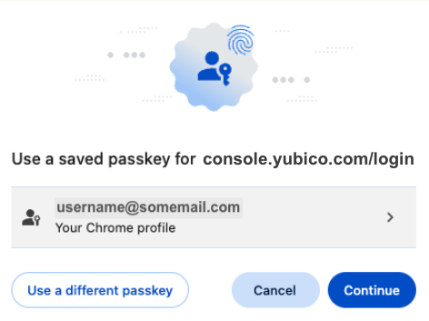 Ensure to select the security key passkey option if your browser suggests other (synced) passkey options. For example in the Chrome scenario below, click Use a different passkey to locate and select the passkey associated with the YubiKey registered with your Customer Portal account.